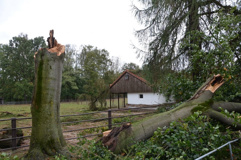 Nach einem Wirbelsturm am gestrigen Abend gegen 18.00 Uhr gleicht der Tierpark einem Schlachtfeld. Umgestürzte Bäume, zerstörte Zäune, kaputte Dächer, fast jedes Gehege im Tierpark ist betroffen. Noch am Abend versuchten die Mitarbeiter viele Tiere in die sicheren Stallungen zu bringen. Besonders bei den Bären eine schwierige Aufgabe, da deren Außenzaun schon zerstört war und kein Elektrozaun die Gehege mehr absichern konnte.